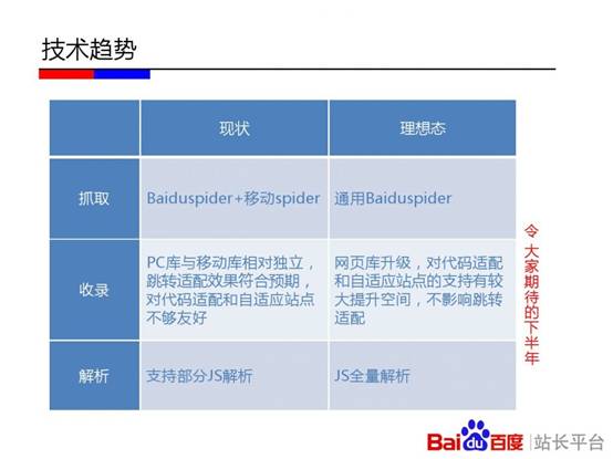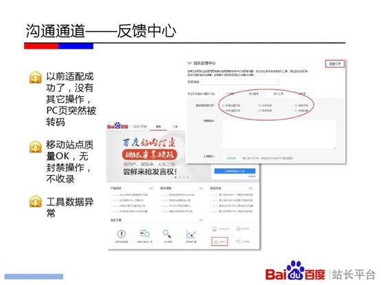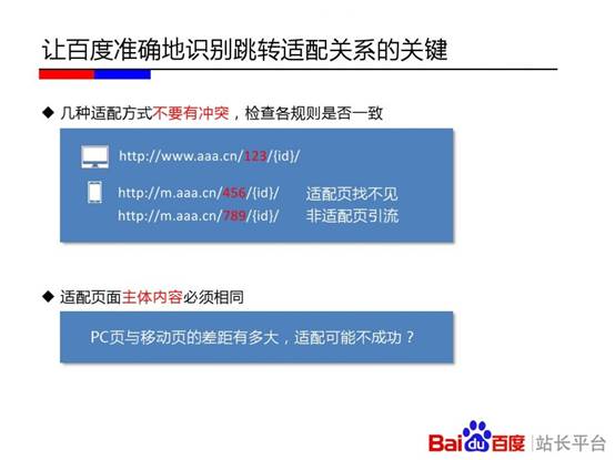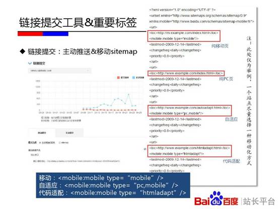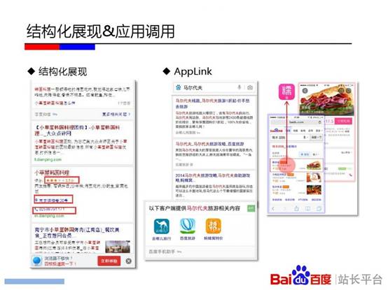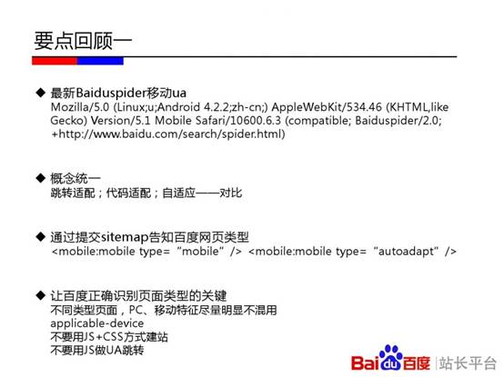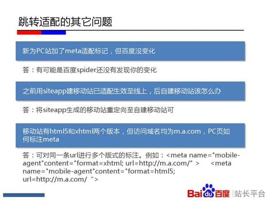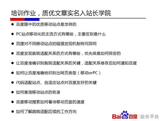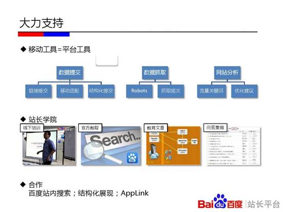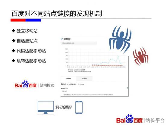 百度站长平台在杭州举办《移动搜索优化实用教程》专场培训。会上,百度讲师刘禾从“发现、收录、展现、优化”四个层面深入解读其中的技术原理。其中,“发现篇”重点介绍了链接发现的重要渠道;“收录篇”讲述了百度区分PC页面和移动页面的原理,及自适应站点与百度的交互;“展现篇”通过介绍百度移动搜索结果的构成和移动搜索结果的特殊性告知站长一些决定排序的影响因素;“优化篇”则分享了如何通过流量与关键词工具分析移动站点流量问题的方法,以及站长最为关心的外链、页面title撰写等问题。以下为百度官方PPT。